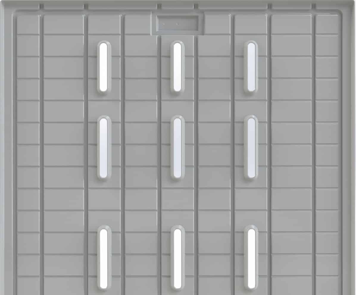 Поддоны для линий по выращиванию салатов, зелени, пряных трав и т.д. могут быть размером до 2420 x 7850 мм. Один или два отстойника с клапаном входят в стандартную комплектацию. Дополнительные отстойники могут быть добавлены или перемещены по запросу.